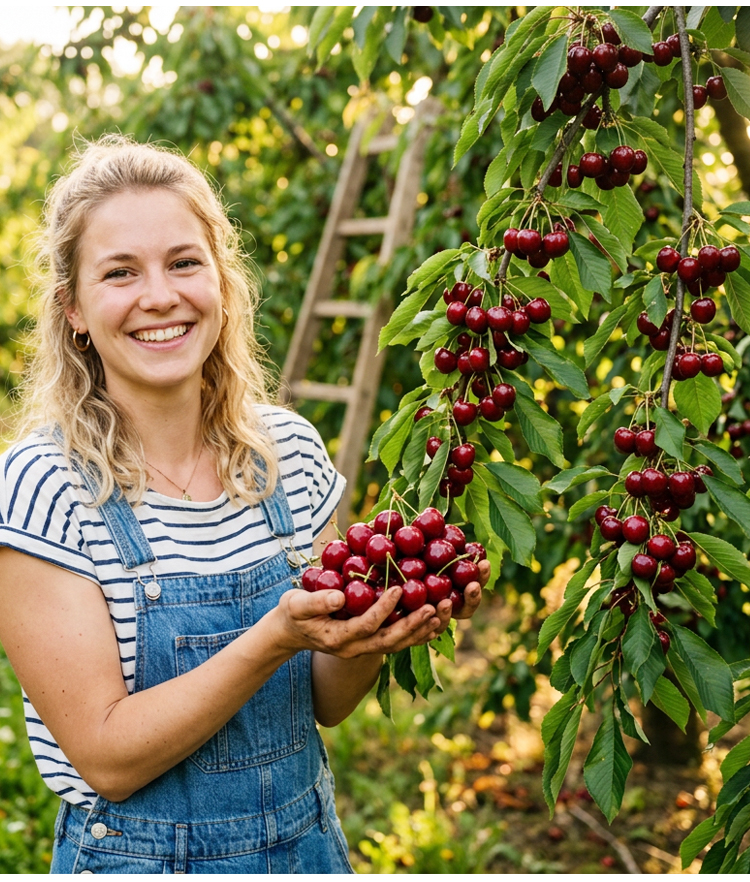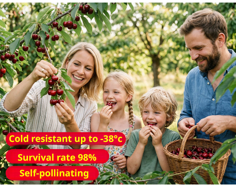 Self-pollinating, produces ripe cherries within the month, with each tree yielding at least 20 kilograms of fruit.